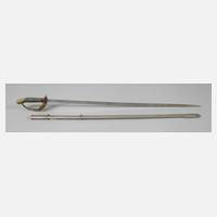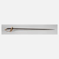 um 1900, Gefäß aus Messing (Pariereisen angebrochen), Griffteil nur noch rudimentär erhalten, schmale Klinge (19 mm) mit beidseitiger Hohlbahn auf 2/3, Korrosionsspuren, ohne Scheide, L ges. ca. 87,5 cm.