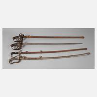 4 Stück: Kavalleriedegen 89 Württemberg, Hersteller Weyersberg Kirschbaum, Eisenkorb und Eisenscheide, Kunststoffgriff, Klinge in der Scheide festgerostet; ein dergleichen ohne Scheide, Hersteller Alex Coppel, Korrosionsspuren, L Klinge ca. 82 cm; ein stark verrosteter Einheitssäbel; Säbel mit Bienenkorbmarke, Messinggefäß mit Haihautgriff, Wicklung defekt, Klingenspitze abgebrochen.