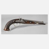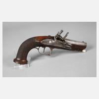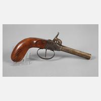 2. Hälfte 19. Jh., 8 cm langer achtkantiger Lauf, Perkussionsschloss, funktionstüchtig, Alters- und Gebrauchsspuren, Zündkappe sehr abgenutzt, L ges. ca. 20,5 cm.
