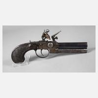 Anfang 19. Jh., untereinander angeordneter Doppelrundlauf, wobei jeder Lauf einzeln abschraubbar ist (L je ca. 7,8 cm), ELG Abnahmemarke mit Stern, Schlossplatte graviert "Liege", Griffteil mit Ziernägeln, Halbschäftung angerissen, Schloss funktioniert bestens, Kal. ca. 10 mm, L ges. ca. 21 cm.