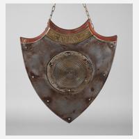 verwendet in Gastwirtschaften, um 1910, für Bleimunition um 5,5 mm, Eisenplatte mit spiegelverkehrten Ringzahlen, auf Holzplatte montiert, Messingschild mit Bezeichnung "Panzerscheibe Roland D.R.G.M. Tilgenkamp Köln Rolandstr. 9", rückseitig Gong (ohne Klöppel), normale Gebrauchsspuren, Maße ca. 48 x 39,5 x 15 cm.