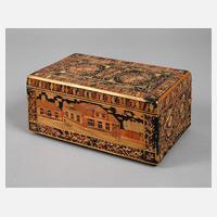 1941, Holz mit Lack und Strohintarsien, im Deckel Hinterglasmalerei, bezeichnet "Russland Weihnachten Paulowsk 1941", Alters- und Gebrauchsspuren, Maße ca. 9 x 20,7 x 12 cm.