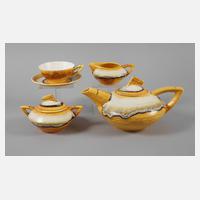 um 1930, Kanne mit schwarzer Stempelmarke, heller Scherben, teils verlaufend und craqueliert glasiert in Creme, Rot und Schwarz über gelbem Fond, doppelkonische Form mit reliefiertem Rippendekor im unteren Bereich und spitzwinkligen Henkeln, bestehend aus Teekanne, Zuckerdose, Milchgießer und Tasse mit Untertasse, Tasse innen craqueliert, sonst guter Zustand, H Kanne 14 cm.