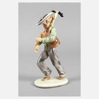 Entwurf Stephan Dakon 1936, schwarze Stempelmarke ca. 1922-1941, Stempelzusatz Made in Austria und Hand-Decorated, geprägte Modellnummer 7595 sowie Nummer 8 und 89, Ritzbuchstaben bx und diverse Pinselbuchstaben, heller Scherben mit polychromer Unterglasurbemalung, auf Ovalsockel schreitender Knabe beim Musizieren, in dynamischer Vorwärtsbewegung, seltenes Stück, Spielpfeife des Dudelsacks fachmännisch restauriert und Glasur partiell etwas craqueliert, H 28 cm. Quelle: Dechant/Goldscheider, Goldscheider - Firmengeschichte und Werkverzeichnis, Arnoldsche 2007, S. 464f.