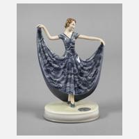 Entwurf Stephan Dakon um 1935, schwarze Stempelmarke 1922-1941, Stempelzusatz Made in Austria und Hand-Decorated, geprägte Modellnummer 7290 sowie Nummer 2, Pinselmonogramm KS ligiert, Pinselnummer XIX und Firmenetikett, heller Scherben mit polychromer Unterglasurbemalung, auf Ovalsockel stehende Frau, das Kleid mit Spitzendekor schmetterlingsartig emporhebend, seltenes Stück in gutem Zustand, H 17 cm. Quelle: Dechant/Goldscheider, Goldscheider - Firmengeschichte und Werkverzeichnis, Arnoldsche 2007, S. 455.