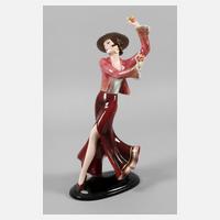 Entwurf Josef Lorenzl 1939, schwarze Stempelmarke mit Zusatz Made in Germany 1938-1941, geprägte Modellnummer 8452 sowie 76 und 31, Prägebuchstabe G, Pinselbuchstabe E. und F. sowie Firmenetikett, heller Scherben mit polychromer Unterglasurbemalung, auf Ovalsockel stehende Spanierin mit Hut und Kastagnetten in dynamischer Tanzpose, beide Zeigefinger fachmännisch restauriert, Glasur partiell etwas craqueliert und winziger Chip am Stand, H 45 cm. Quelle: Dechant/Goldscheider, Goldscheider - Firmengeschichte und Werkverzeichnis, Arnoldsche 2007, S. 496.