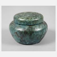 aus der Zeit der Kunsthandwerkersiedlung Gildenhall bei Neuruppin 1923-1929, Pressmarke Mutz Gildenhall, Pinselnummer 5, beiger Scherben mit grünlicher Laufglasur, bauchige Form mit kurzem Hals und gewölbtem Deckel, guter Zustand, H 8,5 cm.