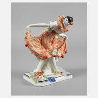 wohl Böhmen, um 1920, ungemarkt, heller Scherben mit farbenfroher Aufglasurbemalung und Goldstaffage, auf unregelmäßigem Sockel mit angedeutetem Fliesenboden und abgelegtem Blumenstrauß stehendes junges Mädchen mit Rose im Haar, ihr Kleid mit Bommelbesatz seitlich emporhebend und in dynamischer Tanzpose, Halskrause mit winzigstem Chip, Vergoldung berieben und Standkante partiell gechipt, H 26 cm.