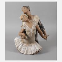 Entwurf Juan Huerta, 1970er Jahre, blaue Stempelmarke mit Zusatz Hand Made in Spain, Modellnummer No. 457, Entwerfersignatur und weitere ungedeutete Signatur, Ritzzeichen und Nummer 8.320, beiger Scherben, teils pastellfarben glasiert, naturalistische Ausformung, Hüftbildnis zweier Tänzer aus dem Ballett "Schwanensee" in inniger Tanzpose, Standkante etwas reinigungsbedürftig, ein Finger restauriert, sonst guter Zustand, H 46 cm.