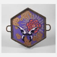 Entwurf und Ausführung um 1922, monogrammiert KW, feine farbige Seidenmalerei Schmetterling vor Ornamenten, unter Glas, bastmontiert gute Erhaltung, L 37 cm. Künstlerinfo: deutscher Designer (1893-1983), Plakatentwürfe, Kartonagen, Gemälde und Entwürfe für die Porzellanmanufaktur Rosenthal Kunstabt. Selb, Lit. vgl. "Und ewig lockt das Weib".