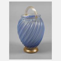 2. Hälfte 20. Jh., klares Glas im Rippenmodel formgeblasen, angesetzter Fuß, Lippenrand und Henkel, mit zerplatztem Goldfoliendekor, Wandung Blau unterfangen, Henkel geklebt, H 20 cm.