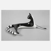 Entwurf Mieczysław Naruszewicz 1958, schwarze Stempelmarke, Pinselnummer C-211-729 sowie 27, stilisierte Ausformung mit Unterglasurbemalung in Schwarz, liegende und zurückschauende Katze, Stand etwas unplan, H 13 cm.