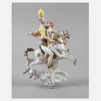 Motiv aus der Serie "1001 Nacht", Entwurf Peter Strang 1967, unterglasurblaue Schwertermarke nach 1973, einmal gestrichen, geritzte Modellnummer 73356, geprägte Bossierernummer 215 mit Jahreszeichen für 1991/92 sowie Pinselnummer 56, naturalistische Ausformung mit polychromer Aufglasurbemalung und sparsamer Goldstaffage, über Wolke mit Taube reitender Orientale, in seinen Armen ein Mädchen haltend, Wandaufhängung, guter Zustand, H 31 cm. Quelle: Bergmann, Meissener Figuren, Supplement-Band, S. 377, Abb. 2866.