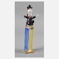 Unikat von Peter Strang aus dem Jahr 2001, unterglasurblaue Schwertermarke, 1. Wahl, geritzte Unikatnummer 150/2001 und reliefiertes Künstlermonogramm, abstrahierte Ausformung mit farbenfroher Aufglasurbemalung und Goldstaffage, über flacher quadratischer Plinthe und hoher rechteckiger Stele Männerbüste mit Anzug und Zylinder sowie weit ausgebreiteten Armen, sehr guter Zustand, H 31 cm.