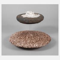 2. Hälfte 20. Jh., die größere mit geritzem Monogramm IL und Nummer 75, die andere ungemarkt, beide rötlicher Scherben mit matten pastösen, teils blasig schaumigen Glasuren in Erdtönen, flache Vasen in Diskusform mit unterschiedlichem kurzen Enghals, guter Zustand, D 18 und 25 cm, H je 6,5 cm.