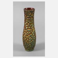 Entwurf Gabriella Törzsök 1930er Jahre, Fünfkirchen-Stempelmarke mit Zusatz Made in Hungary, heller Scherben, innen braun glasiert, außen gelblich-grüne Eosinglasur, kegelförmiger Korpus mit unregelmäßigem Reliefdekor, Glasur minimalst partiell berieben, H 26,5 cm.
