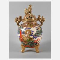 20. Jh., am Boden Stempelmarke und Zusatz Made in Japan, Feinsteinzeug in cremefarbener Craqueléglasur, polychromer Emailbemalung und Goldstaffage, kugeliger Korpus auf drei gerollten Füßen, reliefierte Wandung verziert von figürlicher Darstellung aus der Sagenwelt, die beiden seitlichen Handhaben als auch der Knauf des durchbrochenen Kuppeldeckels in Form plastischer Wächterlöwen gestaltet, Vergoldung berieben, H 41 cm.