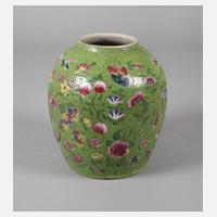 19. Jh., am Boden mit altem Sammlungsetikett, bezeichnet No. 26 Dynasty Taow-kwang 1821–1851, Porzellan in polychromer Aufglasurbemalung, kugeliger Korpus mit kurzem Hals, umlaufend verziert von vegetabilen Elementen und Schmetterlingsmotiven, brandfleckig, berieben, H 18 cm.