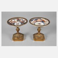 2. Hälfte 19. Jh., Fußschalen aus vergoldeter Bronze in antikisierendem Dekor, die Einsätze aus Porzellan, zart bemalt im Imari-Stil, Alters- und Gebrauchsspuren, H je 11 cm.