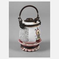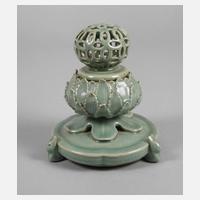 Anfang 20. Jh., am Boden geprägte Stempelmarke, Porzellan in seladonfarbener Craqueléglasur, passig geschweifte Basis mit vier figürlich gearbeiteten Füßen in Form kleiner Hasen, blütenförmiger Korpus, durchbrochen gearbeiteter Aufsatz, dieser mit Fehlstellen, einige Teile lose beigegeben, H 16 cm.