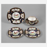 Ende 19. Jh., ungemarkt, in elfenbeinfarbener Craqueléglasur und aufwendiger polychromer Aufglasurbemalung sowie reicher Goldstaffage, Teetasse mit Untertasse und drei zusätzliche Tellerchen, alle verziert von Blumen- und Vogeldarstellungen, kleinere Erhaltungsmängel, D max. 18 cm.