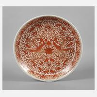 Ende 19. Jh., am Boden gestempelte Vier-Zeichen-Marke, cremefarbene Craqueléglasur und polychrome Aufglasurmalerei, die gemuldete Platte verziert von zwei sich windenden Drachen, gerahmt von kleinteiligem Ornamentdekor, Altersspuren, brandfleckig, D 40 cm.