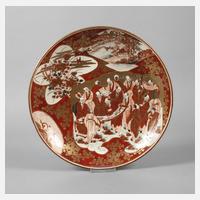 um 1920, gemarkt, elfenbeinfarbene Craqueléglasur, in korallfarbener Aufglasurbemalung und reicher Goldstaffage, leicht gemuldeter Teller, verziert von figürlicher Kartusche, gerahmt von Landschafts- und Blütendarstellung, etwas berieben, D 34 cm.
