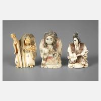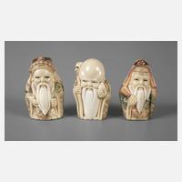 um 1920, signiert, Elfenbein geschnitzt, fein graviert und teils farbig gefasst, plastische Darstellung der drei Glücksgötter Lu, Fu und Shou – Gott des Reichtums und der Fröhlichkeit, der Gott des Ansehens und des Überflusses sowie der Gott der Gesundheit und des langen Lebens, je ca. 5 cm.