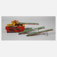 1930er Jahre, ungemarkt, Blech mimikry lackiert, zum Verschießen von Gummigranaten bzw. Kugeln, mit intakter Federspannung, Schutzschild und Laufplatten an den Rädern, Alters- und Gebrauchsspuren, Spannhebel gelötet, L 25 cm.
