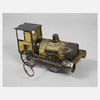Mathias Hess Nürnberg, um 1870, Firmenlogo M.H. und bezeichnet, Reste der Modellnummer sowie Gussräder mit Reichspatentnummer 36181, Blech gelb-schwarz handlackiert, zweiachsige Lok mit intaktem Uhrwerkantrieb und originalem Schlüssel, funktionstüchtiger und sammelwürdiger Zustand mit stärkeren Spielspuren, einige Dellen und Farbabplatzern sowie zwei fehlenden Kleinteile, die Lötstellen wohl herstellungsbedingt, absolute Rarität und Zeugnis der frühen Spielzeugherstellung mit den von Math. Hess 1867 erfundenen und damals innovativen Patent-Blech-Rädern, L 18,5 cm.