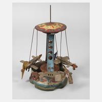 Wilhelm Krauss Nürnberg, um 1925, gemarkt mit Zusatz D.R.G.M. und Made in Germany, Blech farbig lithografiert, drehbar gelagertes Gestell mit drei Flugzeugen und intakter Mechanik, auf Holzsockel montiert, bespielter und reparaturbedürftiger Zustand, partiell flugrostig, H 26 cm.