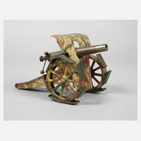 Modell 8045/1, 1930er Jahre, ungemarkt, Blech mimikry lackiert, für Zündblättchenfeuerung, mit intaktem Bajonettverschluss, Schutzschild, verstellbarer Höhenrichtung mittels Stellhebel und Laufplatten an den Rädern, minimale Gebrauchsspuren, Anhängevorrichtung fehlt, L 20 cm.
