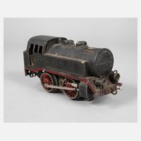 für Bastler, Baujahr 1937, gemarkt, Gehäuseaufschrift abgegriffen, Blech schwarz handlackiert, Spur 0, Achsfolge B, 20-Volt, vor- und rückwärtsfahrend, mit Hand- und Fernschaltung, zwei elektrischen Stirnlampen und einer im Führerhaus, Funktion nicht geprüft, stark bespielter und nicht ganz kompletter Zustand, L 20 cm.