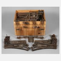 um 1930, teils gemarkt, Spur 1, ca. 50 gebogene und gerade elektrische Schienen, darunter vier Weichen mit Stellhebel und Prellbock mit Federpuffer, dazu weiterer Prellbock, stärkere Alters- und Gebrauchsspuren, Weichen teils reparaturbedürftig.