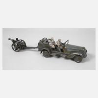 1930er Jahre, ungemarkt, bezeichnet, Blech feldgrau lithografiert, als zweiachsiger Geländewagen mit Uhrwerkantrieb, richtiger Lenkung, höhenverstellbarem Feldgeschütz und vier Massesoldaten als Besatzung, bespielter Zustand mit Altersspuren, Uhrwerk reparaturbedürftig, Geschützmechanik defekt, L Wagen 22 cm, L gesamt 37 cm.