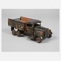 Tipp & Co. Nürnberg, um 1935, ungemarkt, bezeichnet, Blech mimikry lithografiert, dreiachsiger Pritschenwagen mit Uhrwerkantrieb, Nutzlastangabe auf den Türen, zwei Sitzbänken für sechs Massesoldaten (nicht vorhanden), einschlagbarer Vorderachse sowie Scheibenrädern, bespielter und partiell kratzspuriger Zustand, Antrieb reparaturbedürftig, L 19 cm.