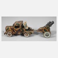 Tipp & Co. Nürnberg, Baujahr 1936-1945, ungemarkt, Vollblechausführung, in Mimikry lithografiert, Sattelschlepper mit intaktem Uhrwerksantrieb, einer Tür und Munitionskiste zum Öffnen, zwei Massesoldaten (von 4) als Besatzung sowie Lafette mit abnehmbarem Minenwerfer für Amorces- und Granatenfeuerung, Kanonenrohr reparaturbedürftig, sonst guter, minimal bespielter Zustand, L gesamt 29 cm.