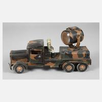 Tipp & Co. Nürnberg, Baujahr 1937-1945, ungemarkt, Vollblechausführung in Mimikry lithografiert, dreiachsiger LKW mit intaktem Uhrwerksantrieb, Fahrertür und Munitionskiste zum Öffnen, verstellbarer Vorderachse, zwei (von 4) Massesoldaten als Besatzung sowie batteriebetriebenem, dreh- und schwenkbarem Scheinwerfer mit Lupenglas (Funktion nicht geprüft), minimal bespielter Zustand, L 24,5 cm.