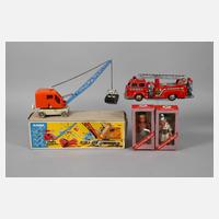 vier Teile, um 1960, gemarkt, Blech und Kunststoff farbig gefasst, bestehend aus Gama Bagger 2808 mit originalem Karton, Nomura/Japan Feuerwehr-Leiterwagen mit Friktionsantrieb, elektrischer Beleuchtung mittels Batterie (Funktion nicht geprüft) und drei plastischen Figuren, davon einer mit Fahne winkend, dazu Sweetheart/August Knoch Trachten-Puppenpaar "Dancing Doll" mit Uhrwerkantrieb, originaler Stoffkleidung und Karton, alle mechanische Funktionen intakt, neuwertiger bis kaum bespielter Zustand, Gummiraupen des Baggers altersbedingt defekt und Sichtfenster eines Puppenkartons gerissen, L Feuerwehr 32 cm, H Puppe je 17 cm.