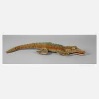 um 1960, ungemarkt, gelb-grün-brauner Mohair hart holzwollegestopft, als liegendes ungegliedertes Krokodil mit offenem Filzmaul, Rückenkamm und Klauen aus Filz sowie Glasaugen, eine Krallenspitze fehlt und minimalster Mohairabrieb, L 68 cm.
