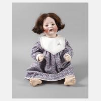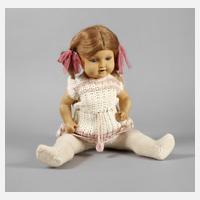 Mädchen, um 1903, gemarkt Walküre Germany, Körper gestempelt Made in Germany, Biskuitporzellan-Kurbelkopf mit offenem Mund, vier Zähnen oben, Kinngrübchen, blauen Schlafaugen, gemaltem Wimpernkranz, reliefierten und gefiederten Brauen, durchstochenen Ohrläppchen mit Schmuck und brauner Echthaarperücke, 15-teiliger Toddlerkörper aus Holz, Pappmaché und Masse, dazu Unterwäsche und Lederschuhe, bespielter Zustand, Stirn seitlich etwas gechipt, Körper minimal masserissig bzw. partielle Farbabplatzer, Finger tlw. alt restauriert, L 50 cm.