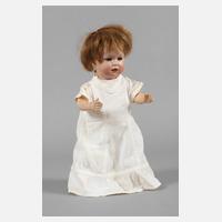 Charaktermädchen, um 1930, gemarkt 2966, 3./6., Spritzporzellan-Kurbelkopf mit offenem Mund, zwei Zähnen oben, blauen Schlafaugen, Brauenstrich und dunkelblonder Kunsthaarperücke, fünfteiliger Sitzbabykörper aus Pappmaché und Masse mit intakter Mamastimme, alte Häkelkleidung, bespielter Zustand, zwei winzigste Farbabplatzer im Gesicht, Körper partiell masserissig und Farbabrieb, L 50 cm.