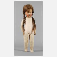 Puppe VIII: Das deutsche Kind, 1950er Jahre, Fußsohle mit Resten einer roten Stempelnummer, drehbarer und bemalter Kunststoffkopf mit braunen Augen mit Lichtpunkt und brauner Echthaarperücke mit Zöpfen, schlanker Nesselkörper mit angewinkelten Schlenkerarmen mit Ellenbogennaht, gescheibten Beinen sowie abgesteppten Fingern und Zehen, unbekleidet, einst geliebte Puppe mit minimalem Farbabrieb auf einer Wange und partiellem Craquelé (vorwiegend im Nacken mit kleinem Farbabplatzer), Körper fleckig, H 50 cm.