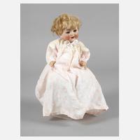 Charakterbaby für Simon & Halbig um 1914, gemarkt K Stern R, Simon & Halbig, 126 (undeutlich), Germany 0, Biskuitporzellan-Kurbelkopf mit offenem Mund, beweglicher Zunge, zwei Zähnen oben, Kinngrübchen, blauen Schlafaugen mit Wimpern, gemaltem Wimpernkranz, gefiederten Brauen und blonder Mohairperücke, fünfteiliger Sitzbabykörper aus Pappmaché und Masse, alt bekleidet, bespielter Zustand, Körperspannung etwas locker, Finger und Zehen berieben bzw. mit Farbabplatzer, L 25 cm.