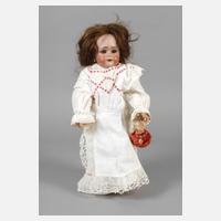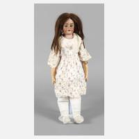 um 1900, gemarkt Germany (undeutlich), 190-5 1/2, Biskuitporzellan-Brustblattkopf mit offenem Mund, Kinngrübchen, blauen Schlafaugen, gemaltem Wimpernkranz, gefiederten Brauen, durchstochenen Ohrläppchen und langer brauner Echthaarperücke, Stoffkörper mit Schlenkergliedern und Celluloid-Unterarmen mit Prägenummer 4, alt bekleidet, bespielter Zustand, ein Ohrläppchen mit Chip, Stoff minimal löchrig und ein Finger bestoßen, L 46 cm.