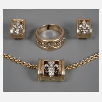 um 1990, Weiß- und Gelbgold gestempelt bzw. geprüft 585/1000, bestehend aus Anhänger an ca. 53 cm langer Kordelkette, einem Paar Ohrstecker von 15 x 11 mm und einem Damenring, RW 19 mm, jeweils durchbrochen gearbeitet und mit zahlreichen Diamanten besetzt, Ring leichte Tragespuren, G gesamt ca. 43,5 g.