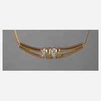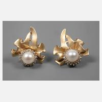 neuzeitlich, Gelbgold geprüft, 585/1000, in Form einer stilisierten Schleife, besetzt mit je einer Zuchtperle von D 7 mm sowie zahlreichen Kleinstdiamanten, minimale Tragespuren, G gesamt 8,9 g.