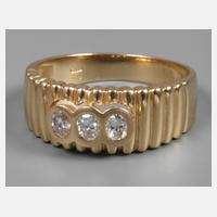 um 1980, Gelbgold gestempelt 585, besetzt mit drei Brillanten im Gesamtgewicht von 0,59 ct, leichte Tragespuren, RW ca. 18 mm, G ca. 4,7 g.