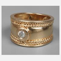 neuzeitlich, Gelbgold gestempelt 585, sich leicht verbreiternde Schiene von max. 13 mm, besetzt mit einem Brillanten von ca. 0,2 ct in Zargenfassung, Tragespuren, RW 17,5 mm, G ca. 9 g.