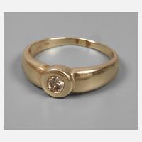 um 1990, Gelbgold gestempelt 750, sich leicht verbreiternde Ringschiene, besetzt mit einem Brillanten von 0,4 ct, Tragespuren, RW ca. 19 mm, G ca. 5,7 g.